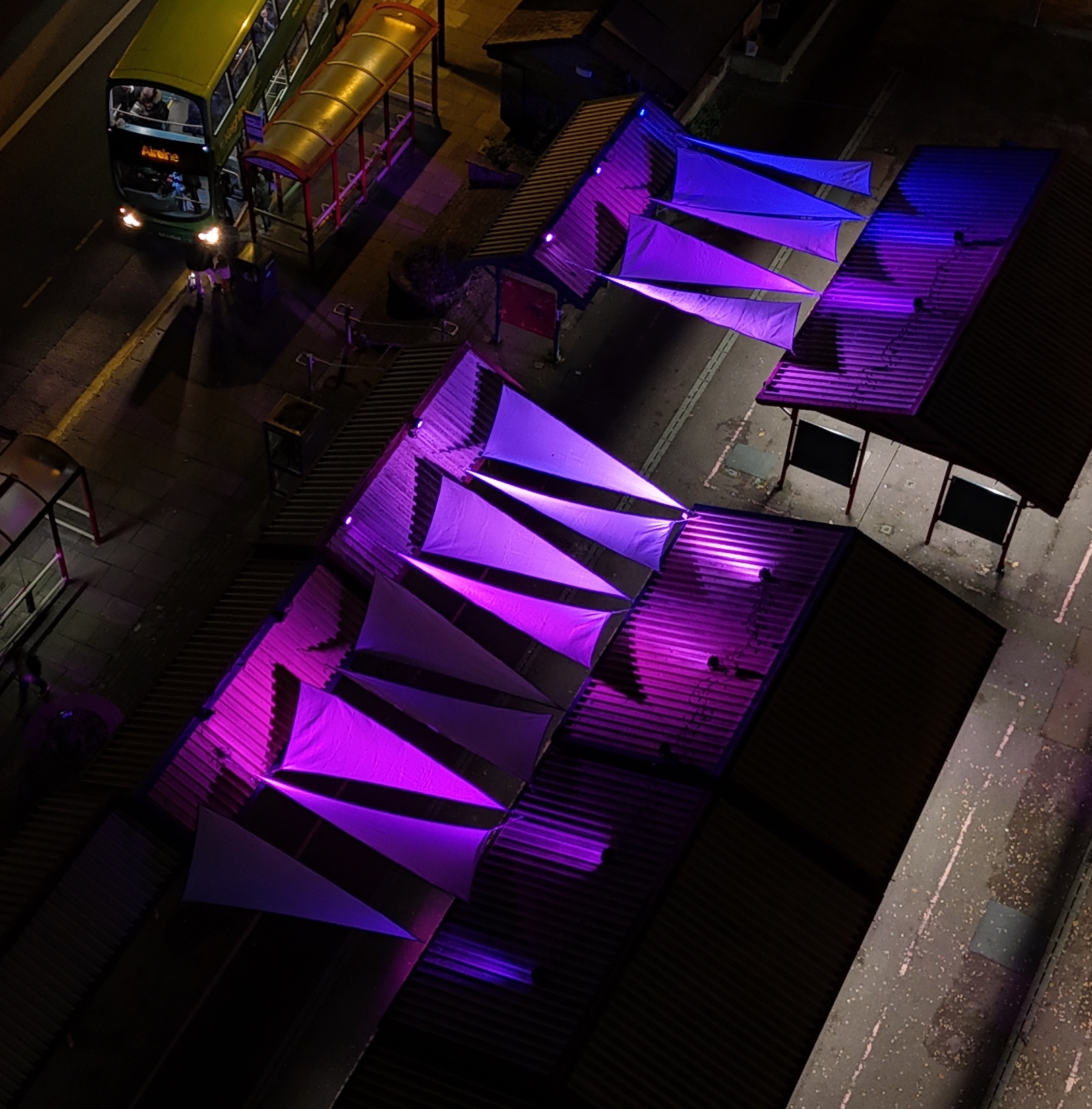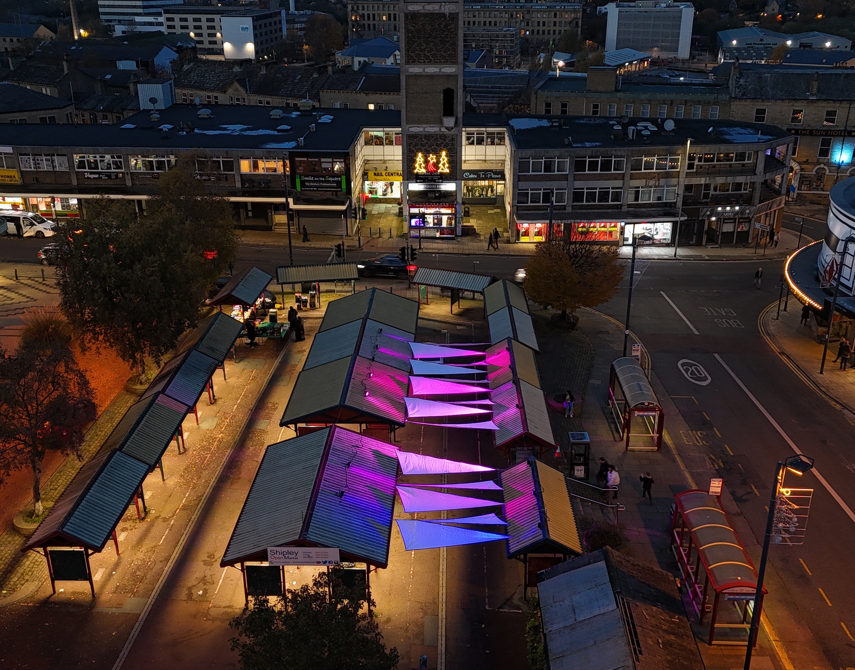 WALK THIS WAY, commissioned for BD:is Lit 2023, was co-produced with 60 young people in Shipley, taking the form of a light and music installation over Shipley Outdoor Market.
